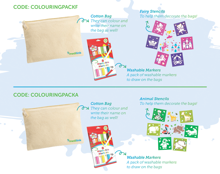 Please note: The items included in this pack are not suitable for children under 3 years old. Children must be supervised at all times. Medilink® accepts no liability or responsibility for any damage or incident that might be caused as a result of utilising this pack. We recommend to leave the ink to dry before putting the bag on, in order to avoid clothing stains. Please be aware that the ink may come off if the bag becomes wet.